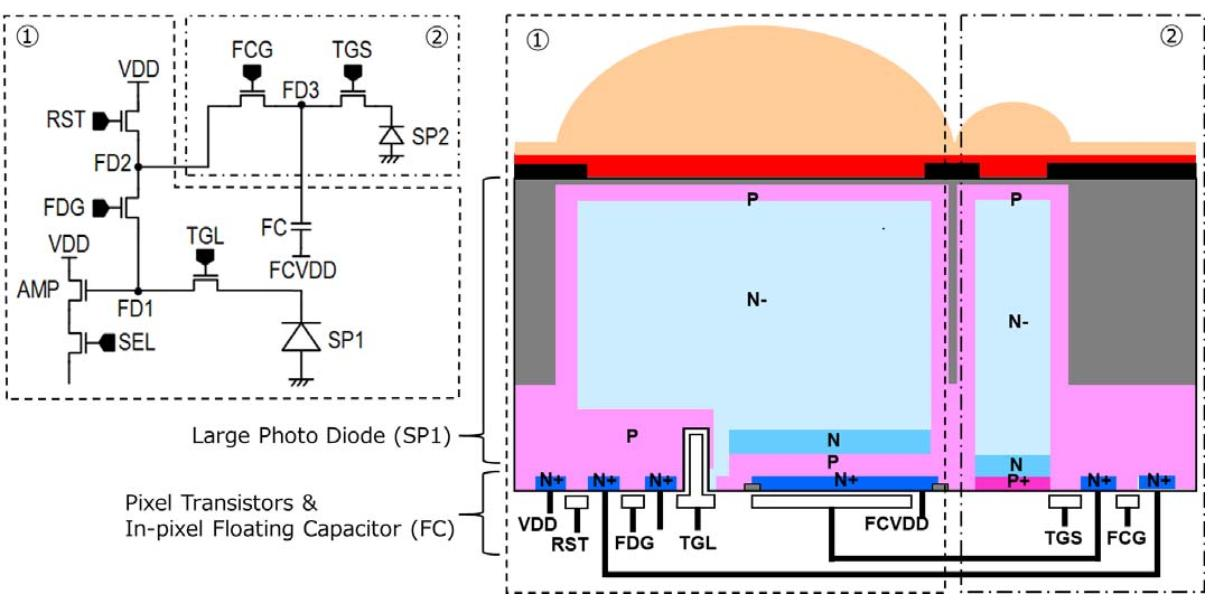 像素采用大光电二极管(SP1)、小光电二极管(SP2)、像素内浮动电容器(FC)和七个晶体管。SP2的灵敏度为SP1的1/14.5,SP2的线性全阱容量(FWC)为165800e-,这归功于FC,从而有效地处理了达到2400ke的电荷。考虑到在0.6 e-rms的高转换增益模式下的SP1随机噪声,简单DR计算为132dB。这七个晶体管如下:SP1(TGL)的传输门、SP2(TGS)的传输栅极、浮动扩散门(FDG)、浮动电容器门(FCG)、复位晶体管(RST)、选择晶体管(SEL)和源极跟随放大器(AMP)。浮动扩散(FD)由FDG和FCG分离为FD1、FD2和FD3,它们用作连接这些FD的开关。FC的两个电极分别连接到FD3和其电源电压为FCVDD的对电极。该原型由像素芯片和逻辑芯片组成。通过使用用于FEOL的90nm工艺和用于BEOL的65nm工艺来制造像素芯片。读出电路(负载MOS晶体管、列ADC、DAC)、驱动器电路(行驱动器、行解码器)、图像信号处理器和其他电路(PLL、MIPI I/F、CPU等)都使用40nm工艺安装到逻辑芯片。比较器的特点是具有2输入系统(两个输入容量、两个差分晶体管和两个自动调零开关)。