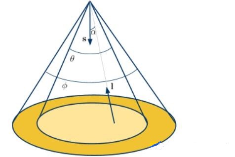 下面我们来确定 \(f_{dir}\) 函数,一个常见的聚光灯模型如图所示: