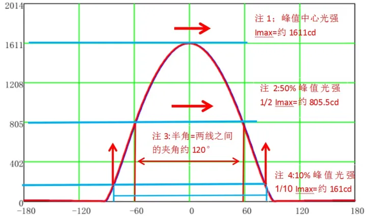 - 半峰边角: 在选定最大光强的平面上,两个为 50% 的最大光强之间的夹角称为半峰边角。从上图可以看出左右各 \(60°\) 相加约等于 \(120°\) ,光束角的大小决定光斑的大小,跟照射效果息息相关.