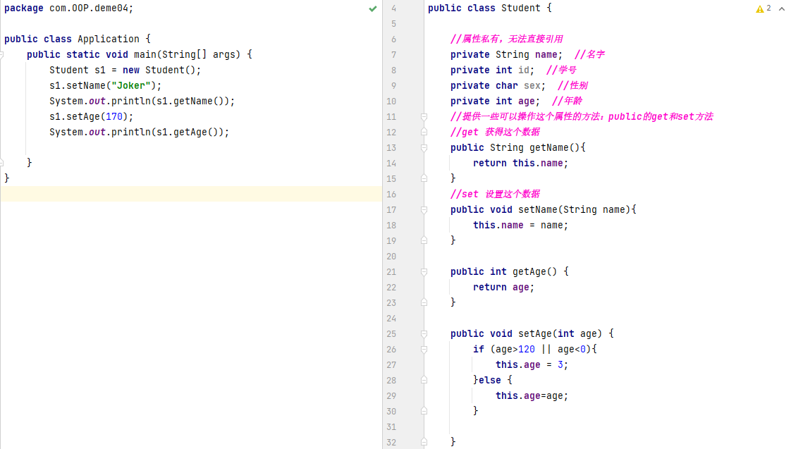 - 高内聚:类的内部数据操作细节自己完成,不允许外部干涉