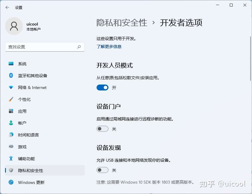 由于采用Sideload即侧载方式,则需要开启Windows 11开发者模式,开启方式为: