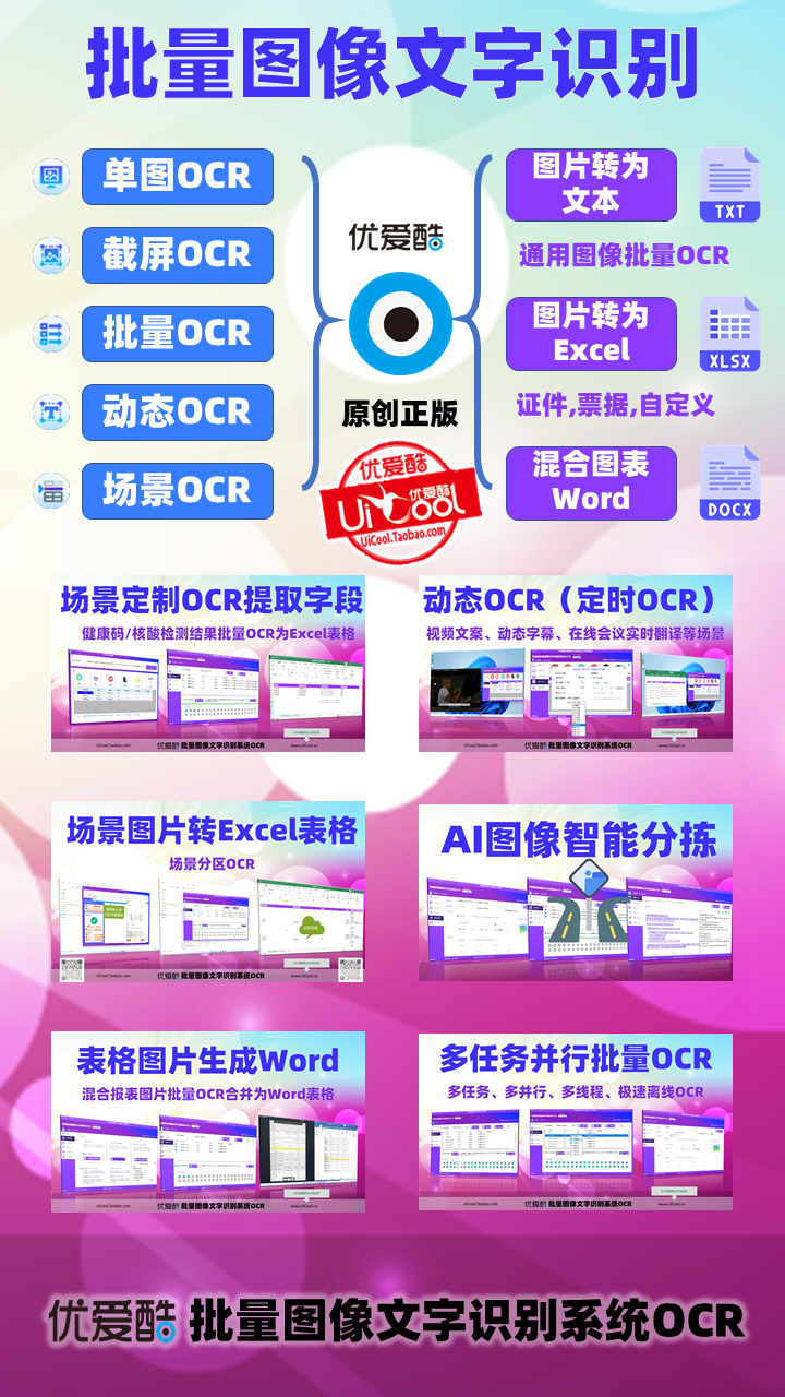 本软件与 “优爱酷批量长网页整页截图系统”配合使用,更加得心应手,只要是截得到的图,就可以用本软件进行批量OCR转为文字。