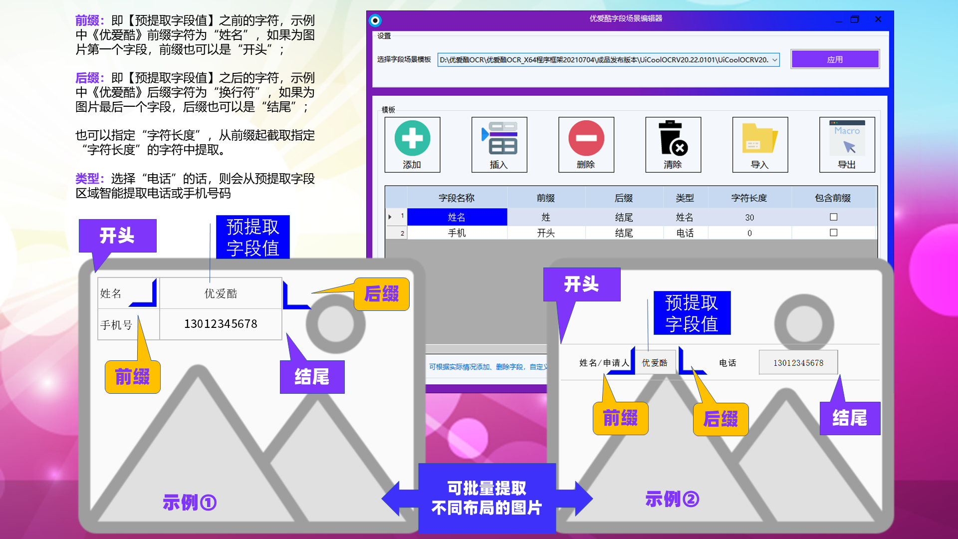 【定制OCR提取字段】,支持用户自定义识别模板,指定需要文字识别的关键字段,实现用户特定格式图片的自动化文字识别和结构化提取,编辑器前缀增加“开头”,后缀增加“结尾”,支持从头到中间或结尾,任意区域的智能提取。