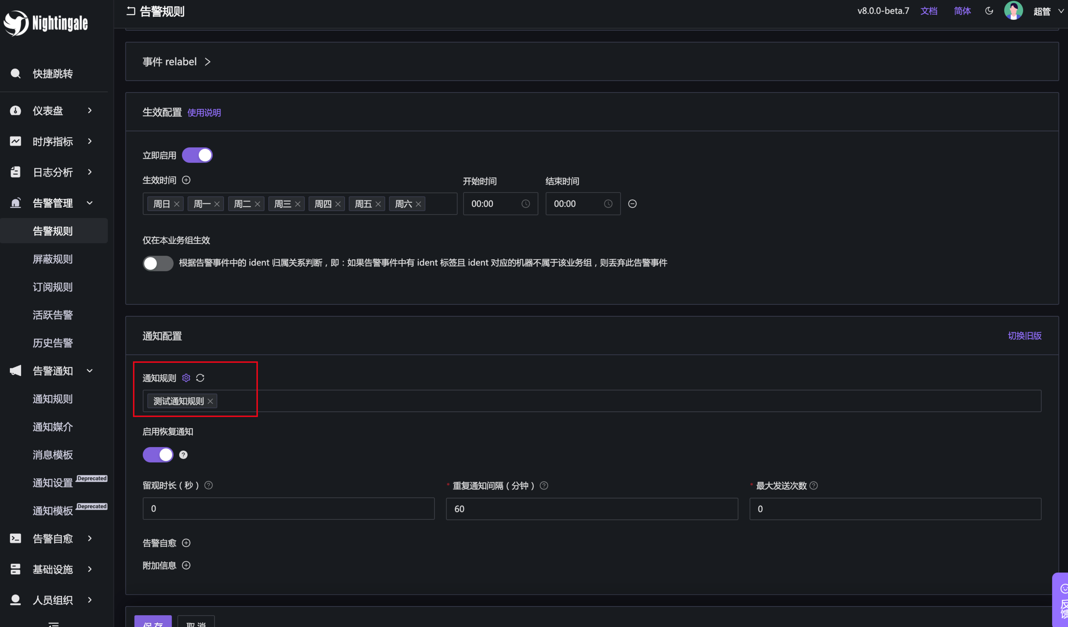 我提前创建了一个通知规则,叫做“测试通知规则”。上图是告警规则的截图,上图中的告警规则关联了“测试通知规则”这个通知规则。
