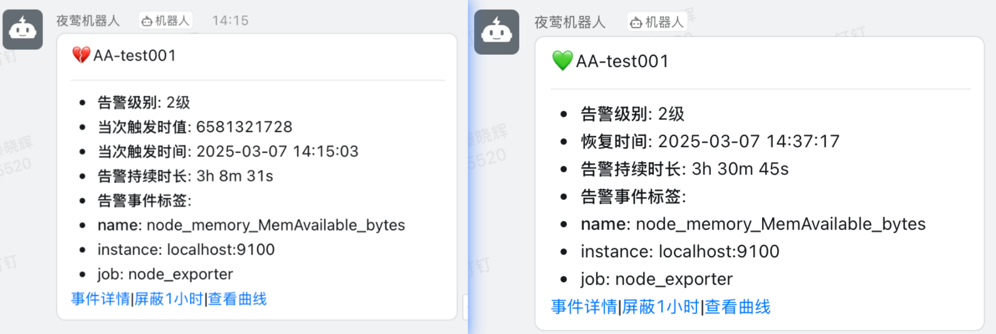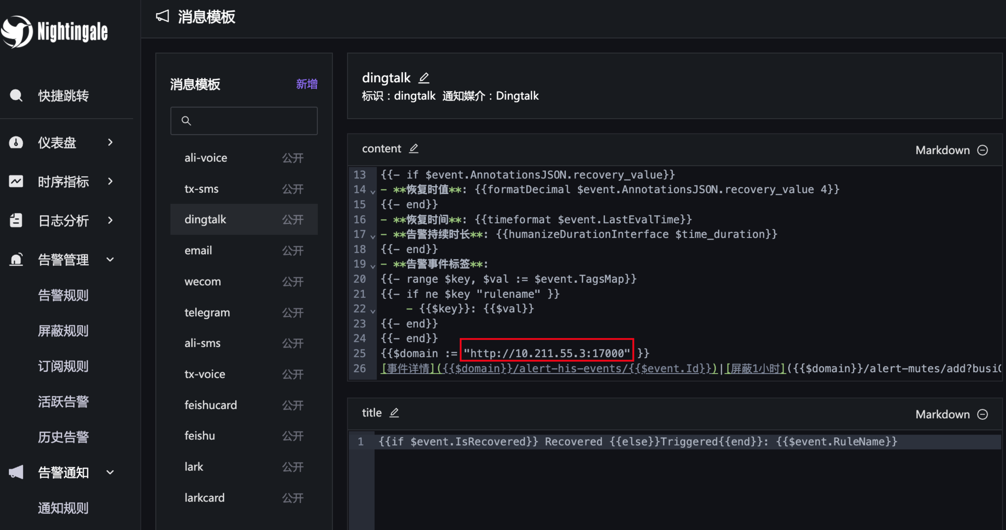 消息模板只改动一个地方,就是 domain 变量,改成你自己的夜莺的域名即可。之后钉钉中收到的消息里的那几个按钮(事件详情|屏蔽1小时|查询曲线)就可以用了。