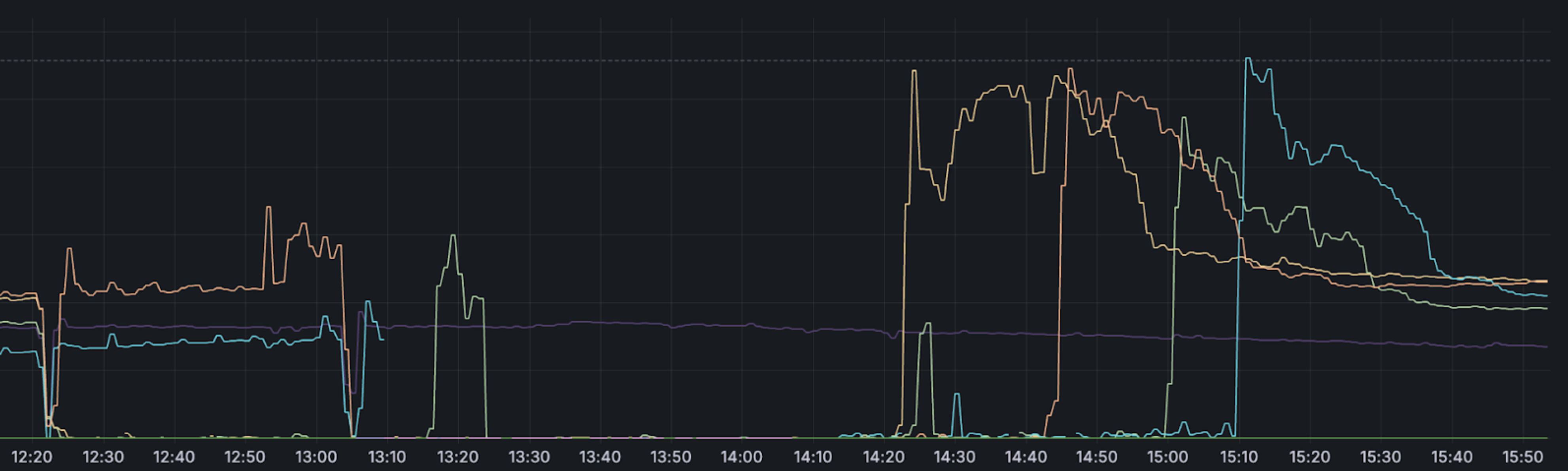 2025 年 4 月 16 日,从 UTC 12:20 到 15:45,我们经历了一次中断,影响了全球大多数用户。在此期间,除了由于时区差异而未受影响的亚太地区外,大部分流量都受到了影响。下面的图表显示了我们外围网络上成功的请求数量,紫色线条代表未受影响的亚太地区。