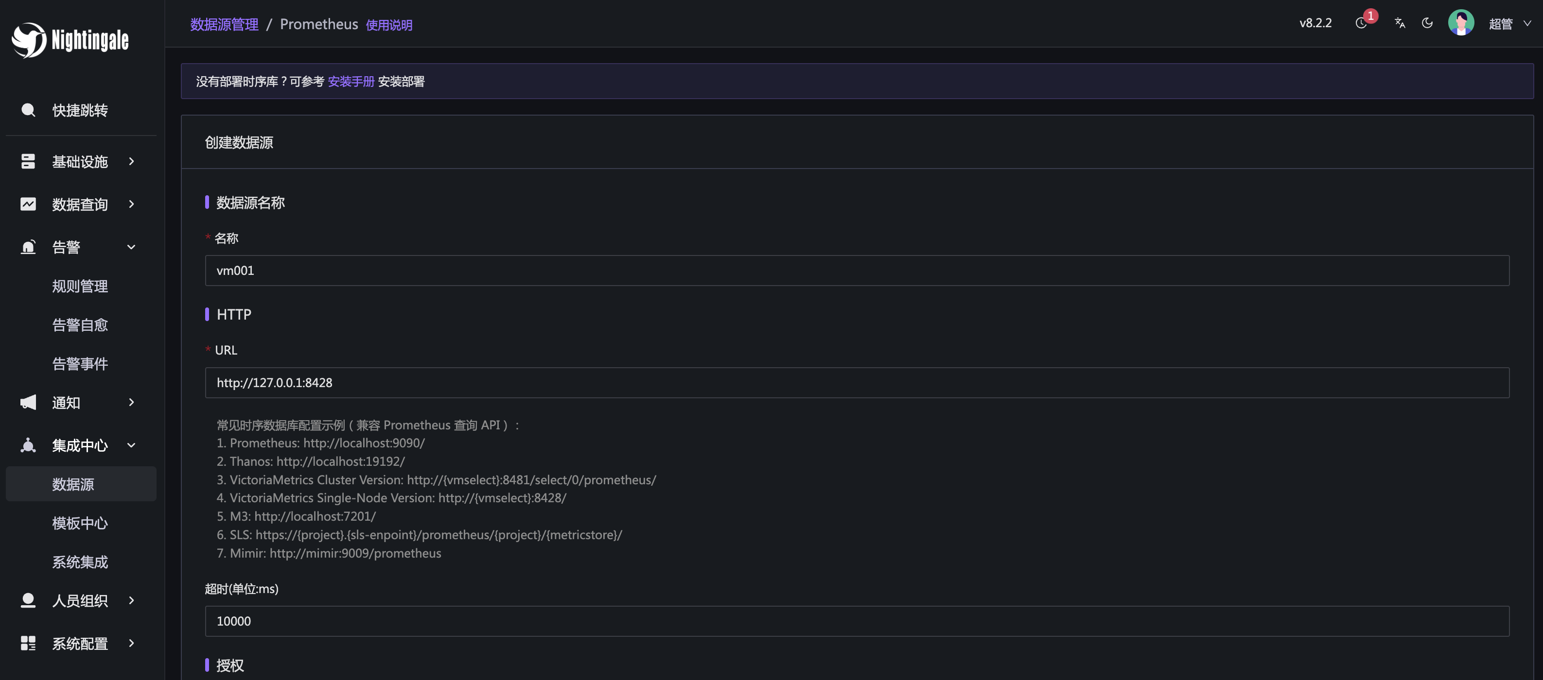 Ctrl + C 先把刚才的夜莺进程停掉,咱们修改一下 etc/config.toml 中的时序库地址,改成刚才启动的 VictoriaMetrics 的地址: