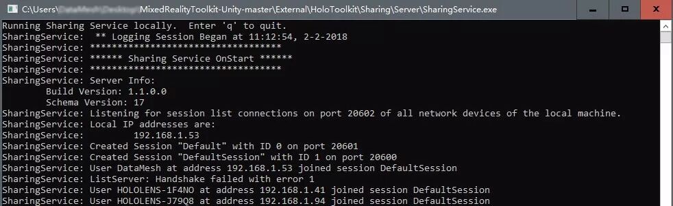 这时,还是通过刚才MRTK选项的下拉菜单中点击Launch Sharing Service运行共享服务,将会在您的机器上创建一个新的服务器实例。如下图: