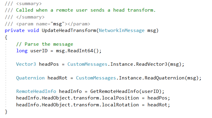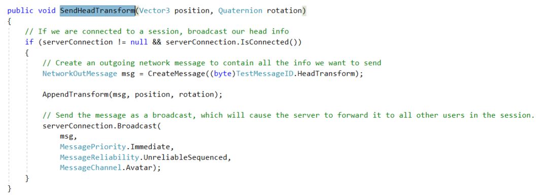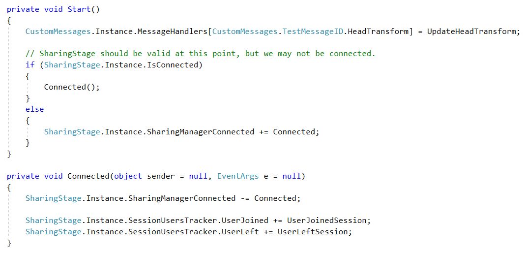接下来,让我们从代码层面来解读一下Sharing模块的工作机制,还是以这个场景为例。在RemoteHeadManager.cs脚本中,在Start回调函数里,第一行代码是将消息处理函数绑定到委托上,这个我们在后边展开来讲。此外则是对服务器进行访问连接,将客户端加入和离开房间的方法绑定到一个负责管理应用程序核心网络层的单例脚本SharingStage.cs中。