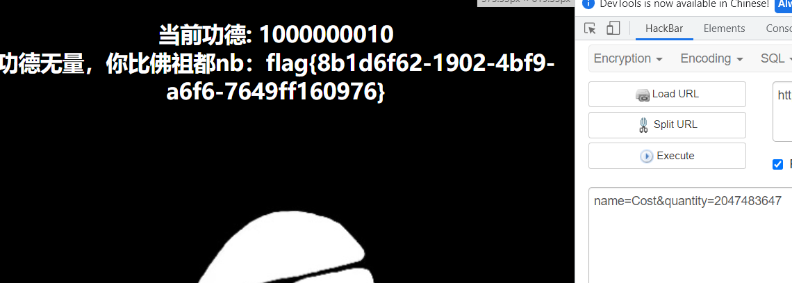 quantity再改小些,负得就更大。传name=Cost&quantity=2047483647,得到flag。