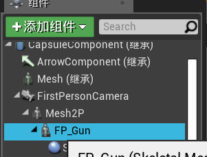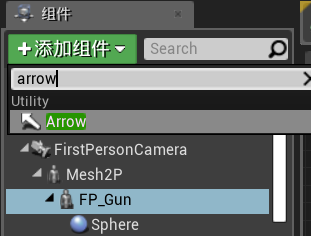 打开人物蓝图,因为我这里使用的是第一人称,所以选择FirstPersonCharacter,在左上方找到FP_Gun(人物枪械模型),在下面添加组件Arrow(箭头),也就是“线”,调整好线的位置,与枪械模型方向一致。