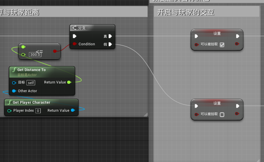 因为我们是300厘米内才可以拾取道具,所以要从Get Distance to中获取距离,并设定为小于300厘米,给与一个分支事件,并创建一个变量来表明是否可以拾取道具