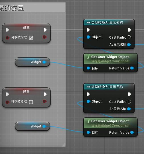 我们作为开发者是知道3米内能拾取道具的,可玩家不知道啊,他又不是开发者,所以我们要照顾玩家感受,给他们一个提醒,但不能赤裸裸的告诉他们“3米内才能拿”,那就成了“哄孩子”,所以这里我选择用信息明暗显示来提醒玩家,这也是游戏内常用的套路。我是用道具名称控件内的文字来做明暗显示,不能拾取物品时,物品名称显示为灰色,可以拾取时显示为白色,这里就又要用到Widget,因为它和控件绑定。拖拽Widget到空白,从蓝色节点拖出蓝线并创建Get User Widget Object(获取用户小部件对象),之后再创建“类型转换为 XXX(控件名称)”,因为我们的Widget class选择的是控件类型,所以抓取Widget对象就是抓取控件类,之后在众多控件蓝图中抓取(类型转换)显示道具名称控件,这样就可以调用该控件内的任何事件或是函数。