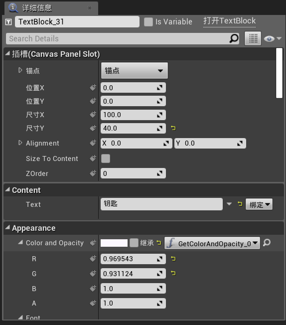 先选定我们的Text文本框,在控件右侧的详细信息内找到Color and Opacity,这边是文字颜色,右侧有个绑定(可以看看上面的Text属性)点进去后再点击创建绑定就能为颜色添加控制函数接口