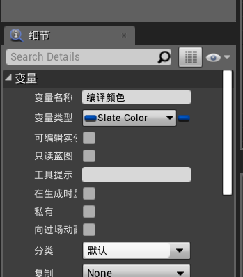 之后我们就需要控制颜色了,左下角创建变量,名称随意,类型设置为Slate Color(石板颜色),这就是控制颜色的参数了,我们需要控制这个参数。