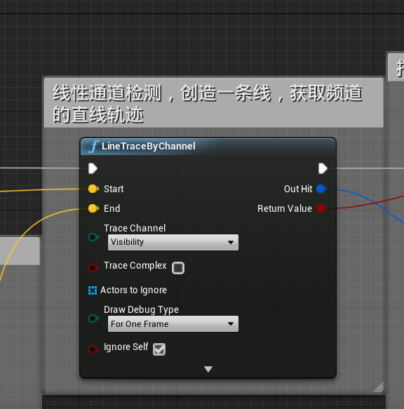 线性检测所用到的检测射线其实就是之前创建的Arrow组件,Arrow是跟随FP_Gun的朝向而发射红线,就像装备在枪上的红外线装置一样,设置DrawDebugType为ForOneFrame,我们只需要对这个组件进行碰撞检测即可,在这里我们用到LineTraceByChannel(按频道跟踪),其实就是对地图上某条线进行碰撞检测。