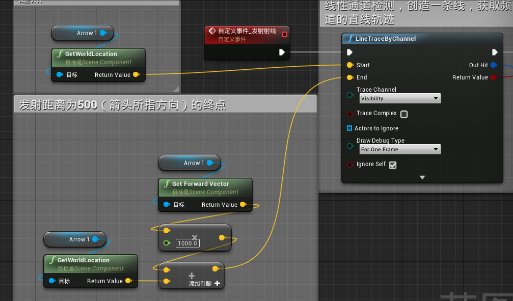 Start就是“线”的起始,End就是“线”的末端,Out Hit就是“线”的碰撞,Return Value就是“线”是否碰撞,我们的射线是基于Arrow组件本身,所以起点设置成Arrow本身的起点即可,而末端则是决定道具距离射线起点多少米才会产生碰撞,这里我设置成10米,由于人物本身就是基于世界在移动,那么获取Arrow的起点只需要用到GetWorldLocation(获取世界位置),之后我们要获取终点,也就是从起点沿射线到10米距离上的点,这就用到了GetForwardVector(获取正向向量),这个事件表示的是某物的正前方,对于射线的起点,它的正前方就是这条线所指向的位置,也就完成所谓“沿着这条线”,之后我们乘以1000厘米(虚幻4以厘米为单位),这里就用到3D数学的知识,空间上要获得终点位置(X、Y、Z)就需要用到乘法,之后与起点相加即可得出终点世界位置(起点随人物移动,终点也需要移动,不是相对位置)。(自定义事件_发射射线会在后面用到)