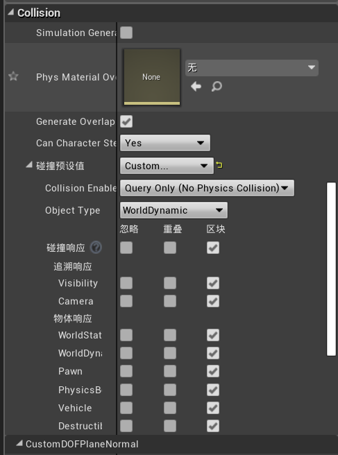 至此,线性检测全部做完,也许是我先做完再写笔记,所以逻辑上是反过来的,不过不影响理解。之后我们可以在视线聚焦那里DIY事件,比如添加个弹窗或者触发机关等,这里要说明一点,如果我们的道具有碰撞事件(Box collision或者Sphere collision)的话,红线的碰撞指向是不会显示出来的,这里需要调整碰撞属性,调整的依据在于Arrow组件的响应属性是Visible,所以碰撞内追溯响应里的Visibility在区块部分画√,其他的随意;很多变量可以不用直接创建,而是将相应变量节点拉出来并提升为变量即可。