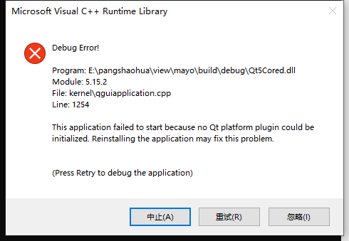 1、程序运行时提示This application failed to start because no Qt platform plugin could be initialized.