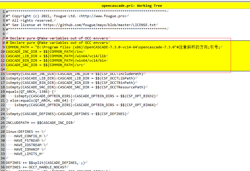 解决方案:打开opencascade.pri文件,增加相应的路径配置