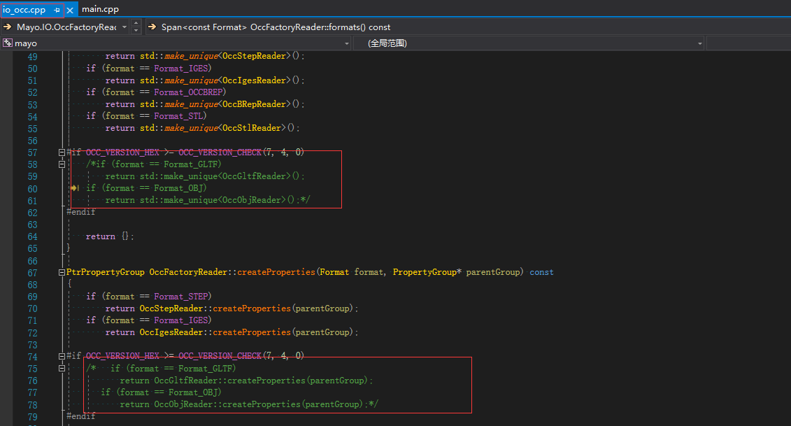 请将io_occ.cpp文件中的对Format_GLTF、Format_OBJ类型支持的代码注释,如下: