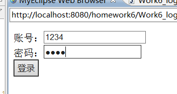 <%@ page language="java" import="java.util.*" pageEncoding="utf-8"%> <!DOCTYPE HTML PUBLIC "-//W3C//DTD HTML 4.01 Transitional//EN"> <html> <head> <title>My JSP 'Work6_login.jsp' starting page</title> </head> <body> <script> function login() { if (form.user.value == "") { alert("账号不能为空!"); form.user.focus(); return; } if (form.password.value == "") { alert('密码不能为空!'); form.password.focus(); return; } if(form.user.value==form.password.value){ form.submit(); }else{ alert('登陆失败'); form.password.focus(); return; } } </script> <form action="Work6_jump.jsp" method="post" name="form"> 账号:<input type="text" name="admin" /> <br> 密码:<input type="password" name="password" /><br> <input type="submit" value="登录" onclick="login()" /> </form> </body> </html>