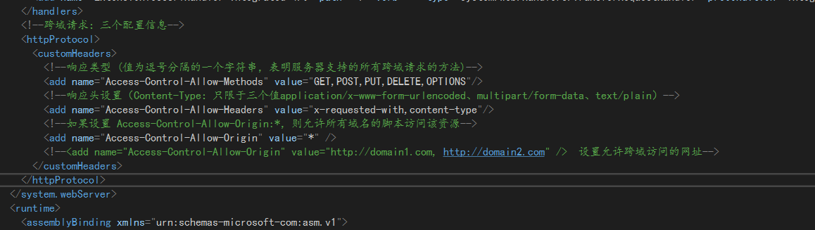 跨域请求:将文件复制到API项目中的Web.config文件中 在</handlers>下插入此段代码
