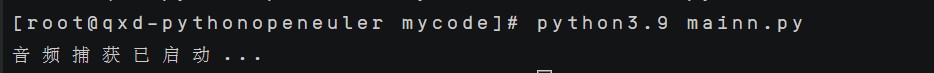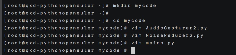 使用vim编辑器,输入vim AudioCapturer2.py、vim NoiseReducer2.py、vim mainn.py,按i进入插入模式,将代码复制粘贴后按Esc + :wq保存退出。效果如下: