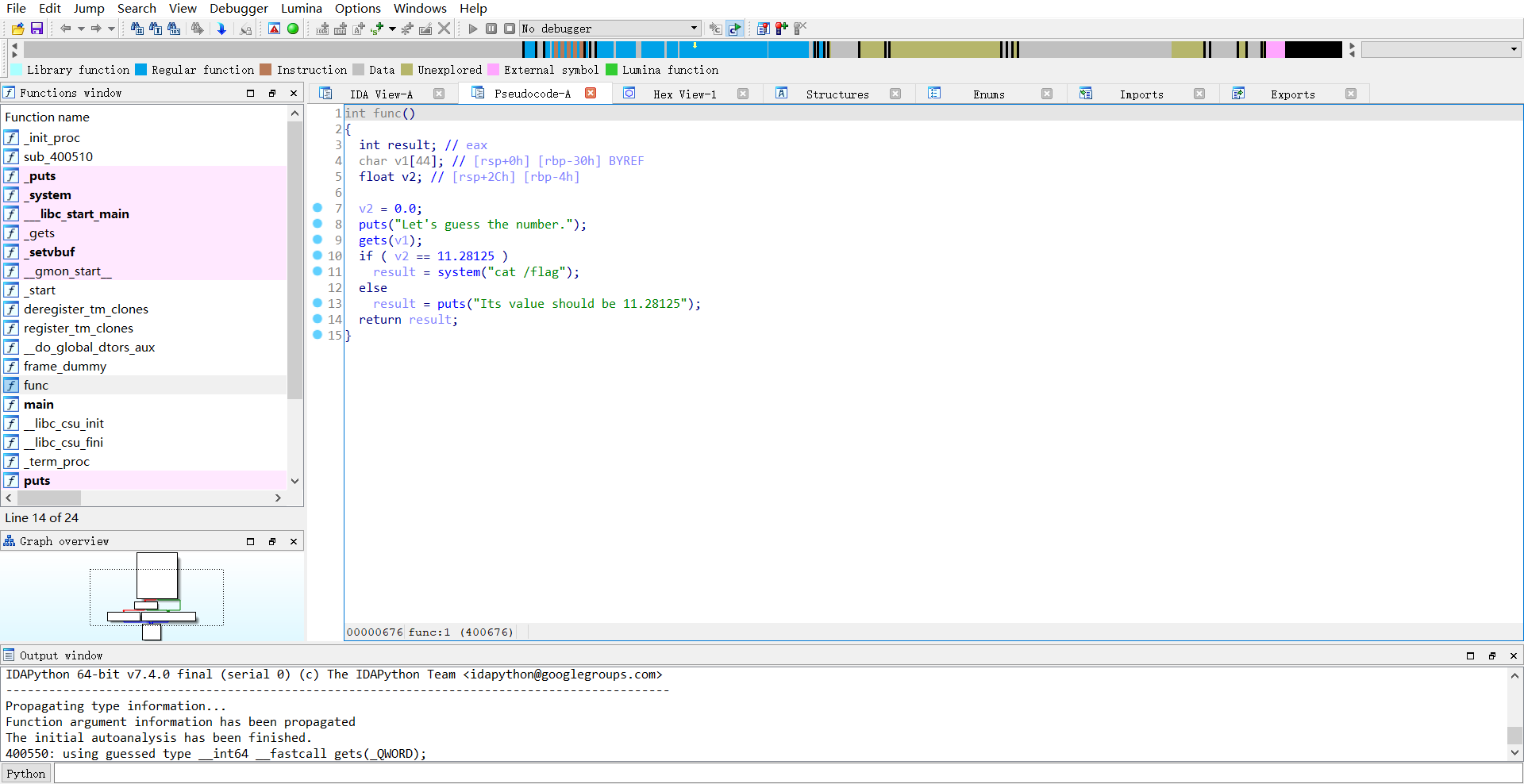 gets接受的是v1的值,要让v2=11.28125,需要在写入v1后覆盖-0x4-(-0x30)=0x2c,11.28125对应的十六进制数0x41348000,且为32位程序