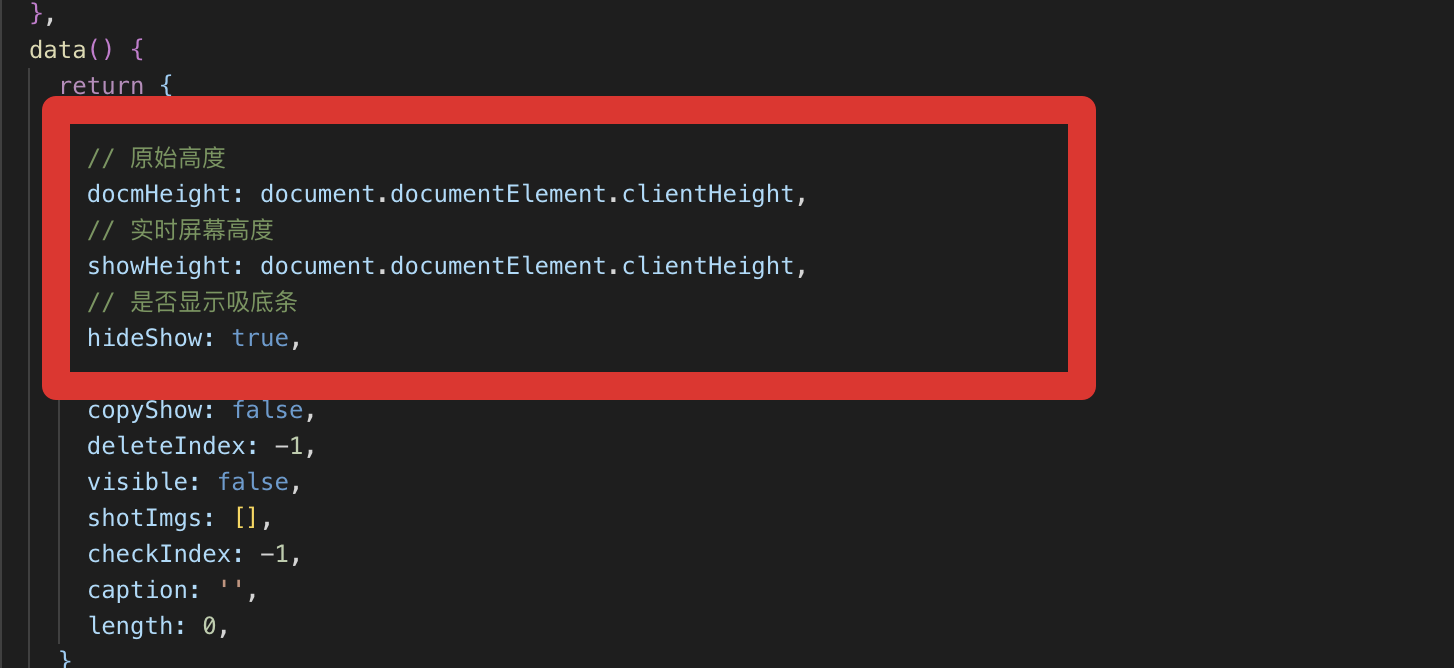 解决:用一个变量控制吸底条的显示隐藏,在页面打开时设置实时屏幕高度。 动态监听页面高度隐藏,原理时在键盘抬起时隐藏吸底条,键盘落下时恢复吸底条,以达到目的