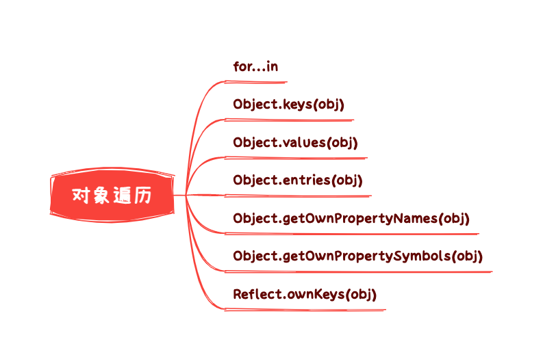 const obj = { a: 1, [Symbol('b')]: 2, [Symbol('c')]: 3, } Object.defineProperty(obj, 'd', { value: 4, enumerable: false }) console.log(obj); // { a: 1, [Symbol(b)]: 2, [Symbol(c)]: 3 } console.log(Object.keys(obj)); // ['a'] - 不包含不可枚举属性 console.log(Object.getOwnPropertyNames(obj)); // [ 'a', 'd' ] - 包含不可枚举属性 console.log(Object.getOwnPropertySymbols(obj)); // [ Symbol(b), Symbol(c) ] console.log(Reflect.ownKeys(obj)); // [ 'a', 'd', Symbol(b), Symbol(c) ]