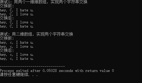 printf("\n测试: 用二维数组,实现两个字符串交换\n");