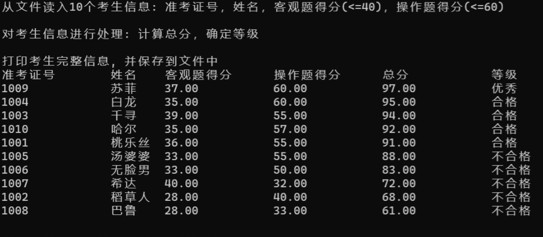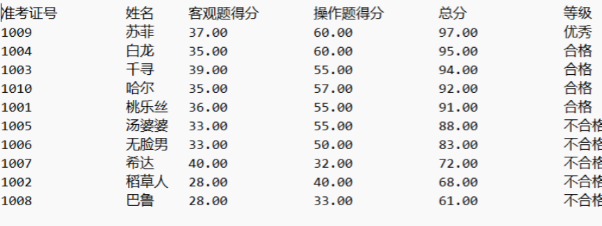 // 输出考生完整信息: 准考证号,姓名,客观题得分,操作题得分,总分,等级