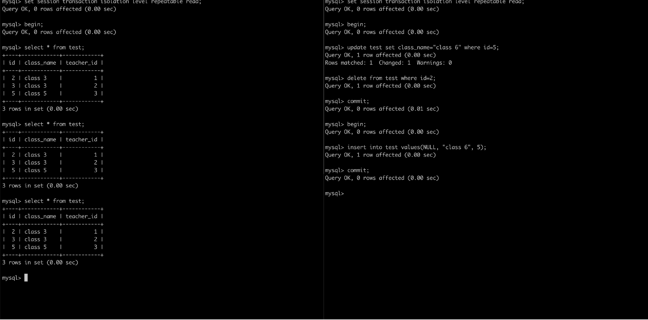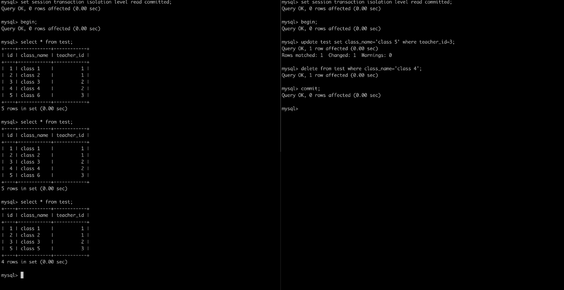 - 如图1,先把当前会话隔离级别设置成RC,然后两个会话分别开启事务,事务B更新了teacher_id=3的数据,删除了class_name="class 4"的数据,事务A读取了3次数据,第一次在事务B未修改数据前,第二次在事务B修改数据还未提交,最后一次是在事务B提交修改后,可以看出RC隔离级别消除了脏读,但有不可重复读问题。