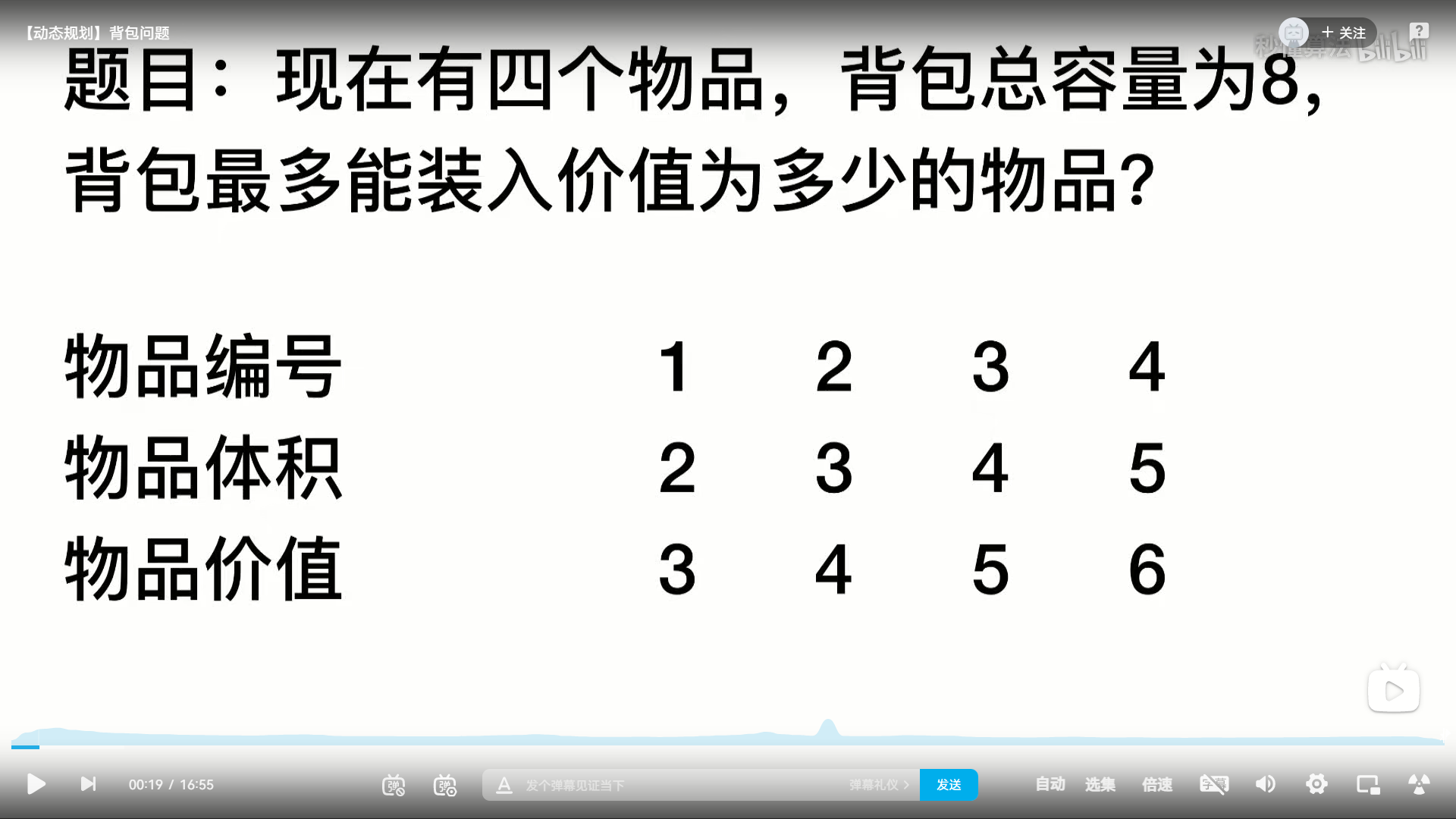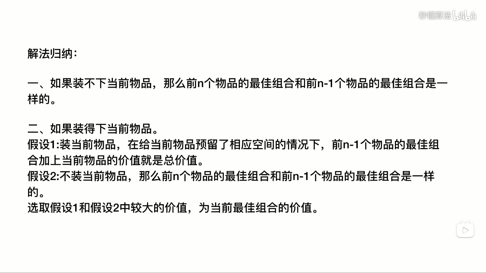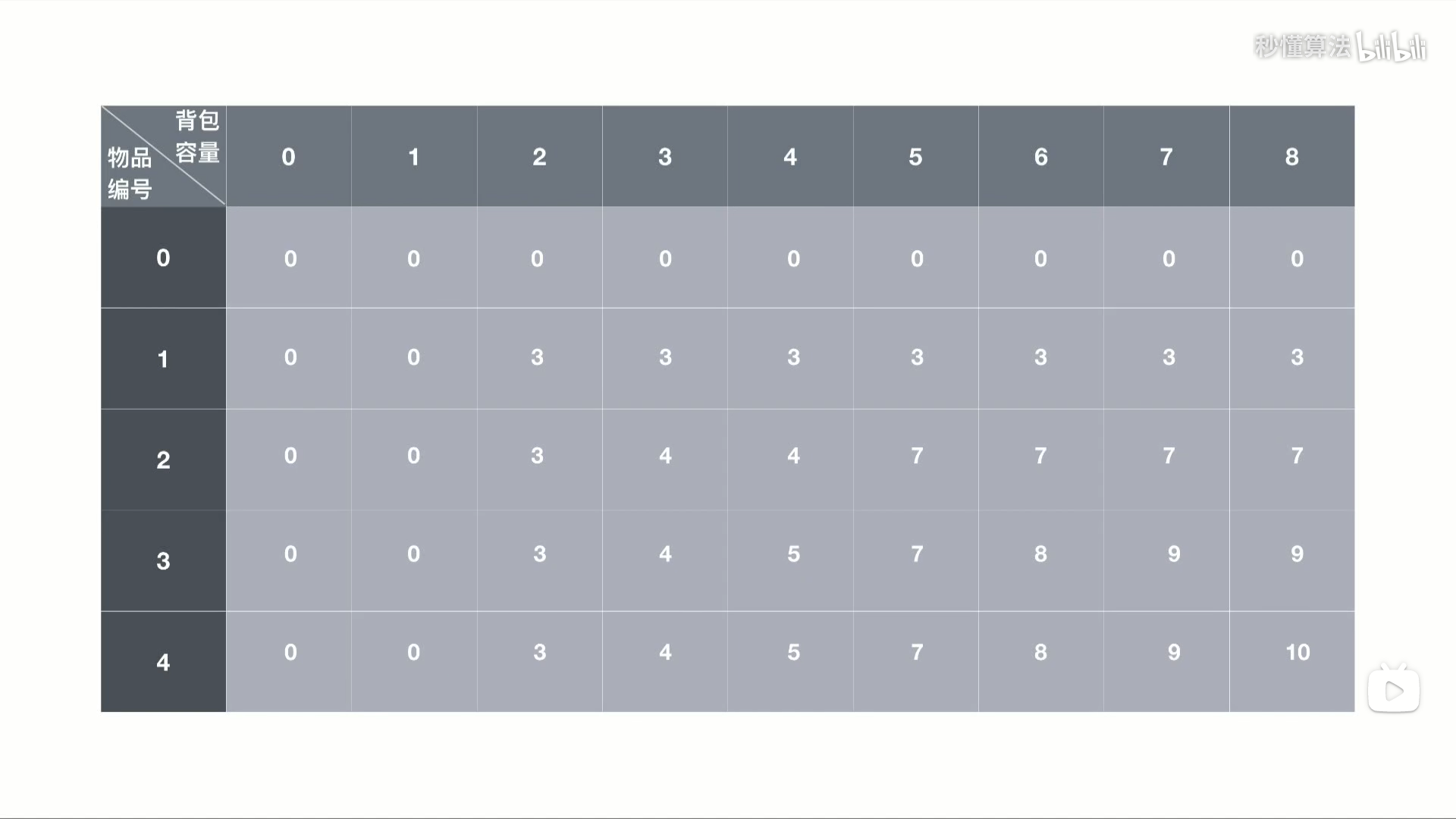 public class CodeBag { public static void main(String[] args) { int[] weight = {1, 3, 4}; int[] value = {15, 20, 30}; int bagsize = 4; testweightbagproblem(weight, value, bagsize); } public static void testweightbagproblem(int[] weight, int[] value, int bagsize) { int wlen = weight.length, value0 = 0; //定义dp数组:dp[i][j]表示背包容量为j时,前i个物品能获得的最大价值 int[][] dp = new int[wlen + 1][bagsize + 1]; //初始化:背包容量为0时,能获得的价值都为0 for (int i = 0; i <= wlen; i++) { dp[i][0] = value0; } //遍历顺序:先遍历物品,再遍历背包容量 for (int i = 1; i <= wlen; i++) { for (int j = 1; j <= bagsize; j++) { if (j < weight[i - 1]) {//weight只有0以后的,计算判断时以前一个weight对应 dp[i][j] = dp[i - 1][j]; } else { dp[i][j] = Math.max(dp[i - 1][j], dp[i - 1][j - weight[i - 1]] + value[i - 1]); } } } //打印dp数组 for (int i = 0; i <= wlen; i++) { for (int j = 0; j <= bagsize; j++) { System.out.print(dp[i][j] + " "); } System.out.print("\n"); } } }