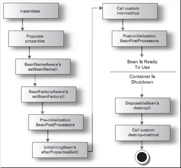 1 package com.gyf.model; 2 3 4 import org.springframework.beans.BeansException; 5 import org.springframework.beans.factory.BeanFactory; 6 import org.springframework.beans.factory.BeanFactoryAware; 7 import org.springframework.beans.factory.BeanNameAware; 8 import org.springframework.beans.factory.DisposableBean; 9 import org.springframework.beans.factory.InitializingBean; 10 11 public class User implements BeanNameAware,BeanFactoryAware,InitializingBean,DisposableBean{ 12 13 private String username; 14 private String password; 15 16 public String getUsername() { 17 return username; 18 } 19 20 public void setUsername(String username) { 21 System.out.println("2. 赋值属性username:" + username); 22 this.username = username; 23 } 24 25 public String getPassword() { 26 return password; 27 } 28 29 public void setPassword(String password) { 30 System.out.println("2. 赋值属性password:" + password); 31 this.password = password; 32 } 33 34 public User() { 35 System.out.println("1. 实例化。。。"); 36 } 37 38 @Override 39 public String toString() { 40 return "User{" + 41 "username='" + username + '\'' + 42 ", password='" + password + '\'' + 43 '}'; 44 } 45 46 @Override 47 public void setBeanName(String s) { 48 System.out.println("3. 设置bean的名字(为配置文件中bean的id)" + s); 49 } 50 51 @Override 52 public void setBeanFactory(BeanFactory beanFactory) throws BeansException { 53 //bean工厂就是容器,意思是把我们的user对象放进工厂(容器)中去 54 System.out.println("4. Bean工厂" + beanFactory); 55 } 56 57 @Override 58 public void afterPropertiesSet() throws Exception { 59 System.out.println("6. 属性赋值完成。"); 60 } 61 62 public void myInit(){ 63 System.out.println("7. 自定义的初始化方法。"); 64 } 65 66 @Override 67 public void destroy() throws Exception { 68 //资源释放 69 System.out.println("9. Bean对象被销毁(不用的时候从容器中移除)。"); 70 } 71 72 public void myDestory(){ 73 //资源释放 74 System.out.println("10. 自定义的销毁方法。"); 75 } 76 }