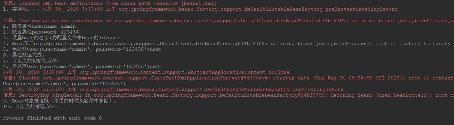 1 <?xml version="1.0" encoding="UTF-8"?> 2 <beans xmlns="http://www.springframework.org/schema/beans" 3 xmlns:xsi="http://www.w3.org/2001/XMLSchema-instance" 4 xsi:schemaLocation=" 5 http://www.springframework.org/schema/beans http://www.springframework.org/schema/beans/spring-beans.xsd"> 6 7 <bean id="user" class="com.gyf.model.User" init-method="myInit" destroy-method="myDestory"> 8 <property name="username" value="admin"></property> 9 <property name="password" value="123456"></property> 10 </bean> 11 12 <!--配置bean处理器--> 13 <bean id="beanProcess" class="com.gyf.model.MyBeanPostProcessor"></bean> 14 </beans>