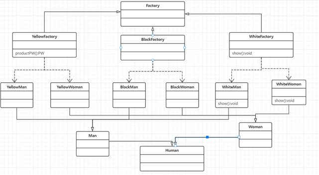 public class White implements Factory{ public Man produceMan() { return new WhiteMan(); } public Woman produceWoman() { return new WhiteWoman(); } }