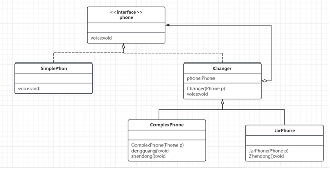 public class Changer implements Phone{ private Phone phone; public Changer(Phone p) { this.phone=p; } public void voice() { phone.voice(); } }