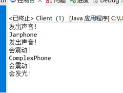 public class Client { public static void main(String[] args) { Phone phone; phone=new SimplePhone(); phone.voice(); JarPhone jarphone=new JarPhone(phone); jarphone.voice(); jarphone.zhendong(); ComplexPhone complexphone = new ComplexPhone(phone); complexphone.zhendong(); complexphone.dengguang(); } }
