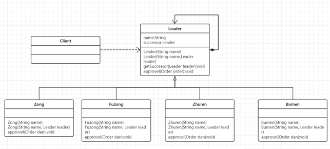 public abstract class Leader { protected String name; protected Leader successor; public Leader(String a){name=a;} public void setSuccessor(Leader a){ successor=a; } public Leader(String a,Leader b){ name=a; successor=b; } public abstract void approvel(Order dan); }