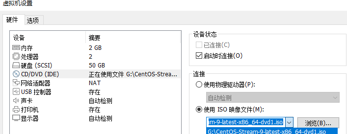 自定义 → 硬件兼容性:workstation 16.X → 稍后安装操作系统 → 客户机操作系统:Linux;版本:其他Linux 5.x 及更高版本内核64位 → 虚拟机名称:CentOS 9 Stream;位置:G:\Virtual Machines\CentOS 9 Stream → 处理器数量:1;每个处理器的内核数量:2 → 此虚拟机的内存:2GB → 使用网络地址转换 → I/O控制器类型:LSI Logic → 虚拟磁盘类型:SCSI → 选择磁盘:创建新虚拟磁盘 → 最大磁盘大小:50GB;将虚拟磁盘拆分成多个文件 → 磁盘文件:CentOS 9 Stream.vmdk