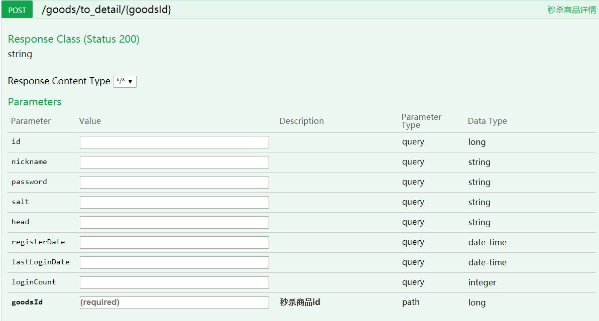 @ApiOperation(value = "秒杀商品详情") @ApiImplicitParam(name = "goodsId", value = "秒杀商品id", dataType = "long", paramType = "path", required = true) @RequestMapping("/to_detail/{goodsId}") public String detail(Model model, MiaoshaUser user,@PathVariable long goodsId) {