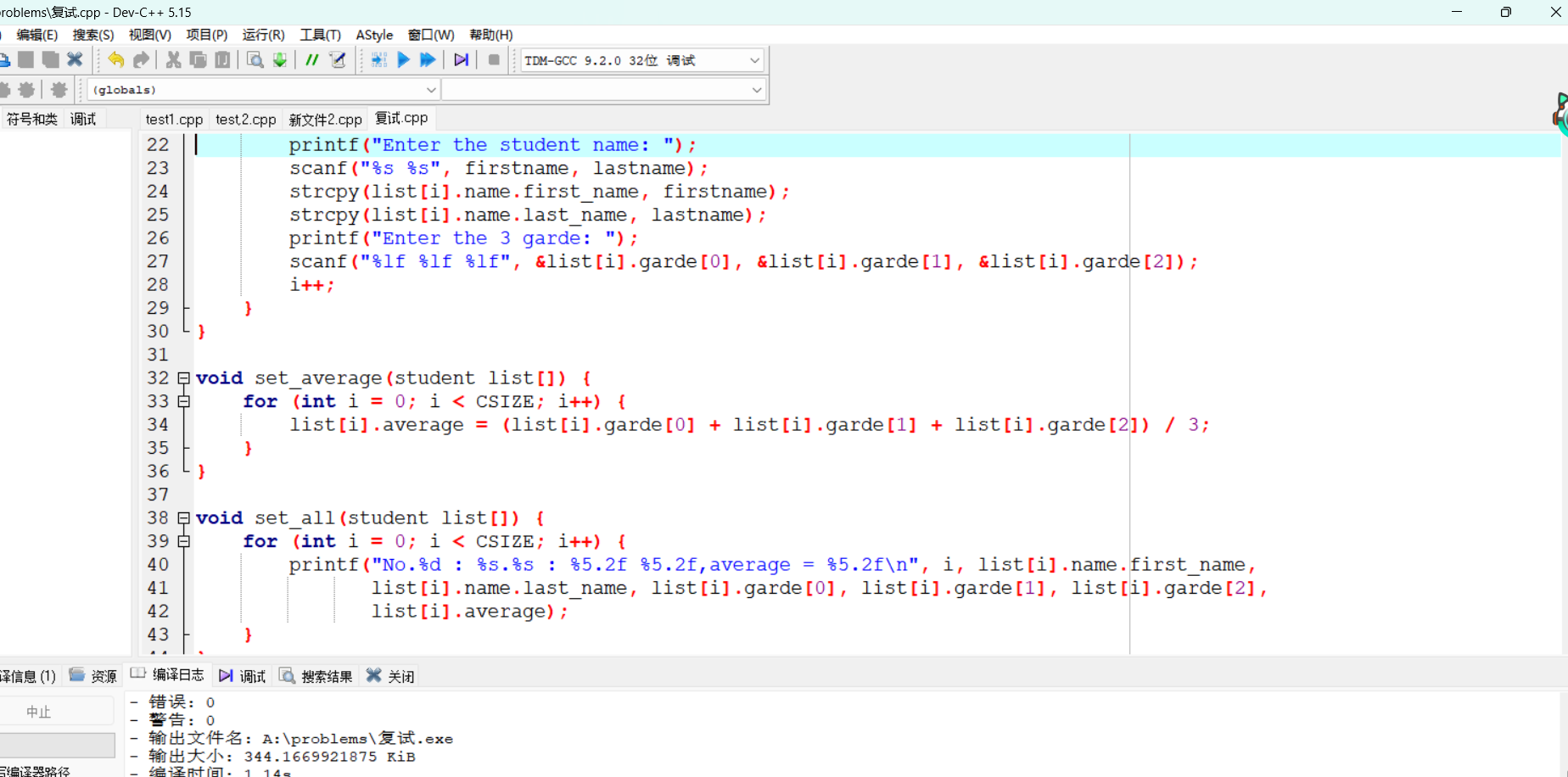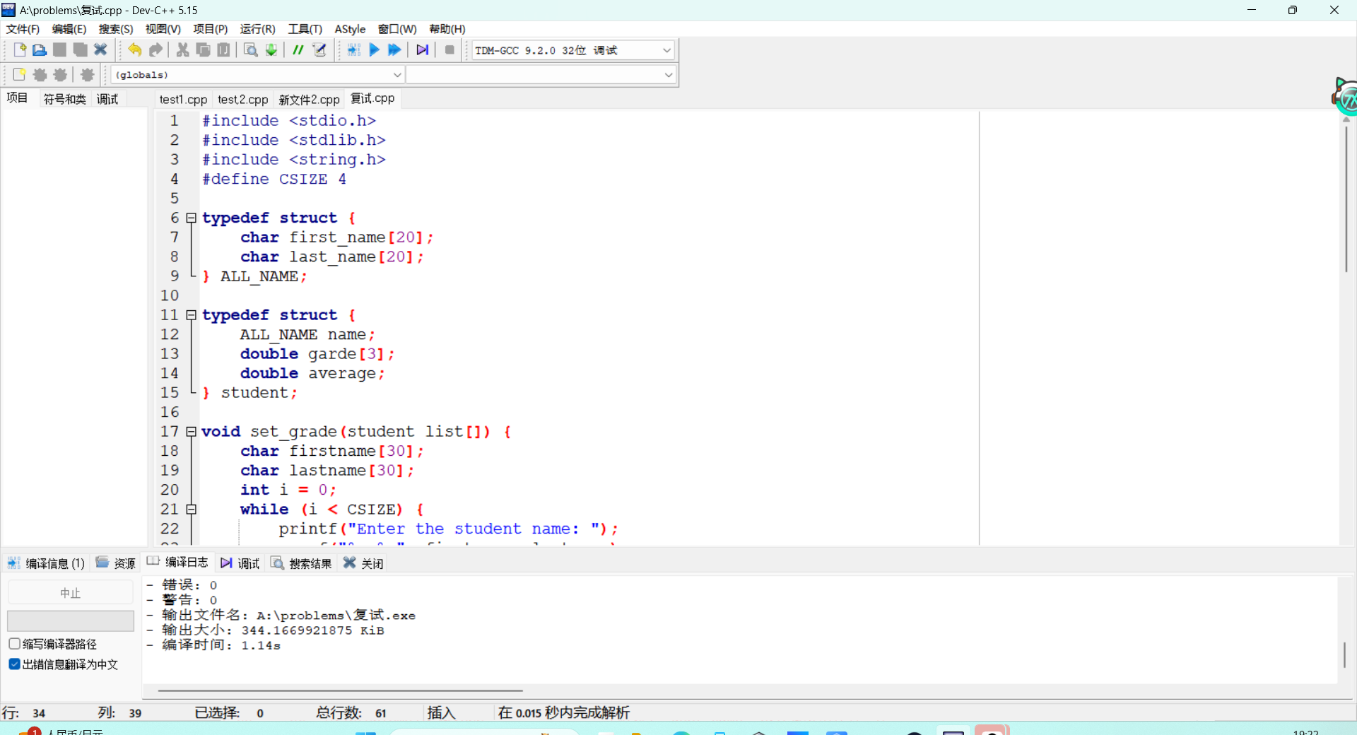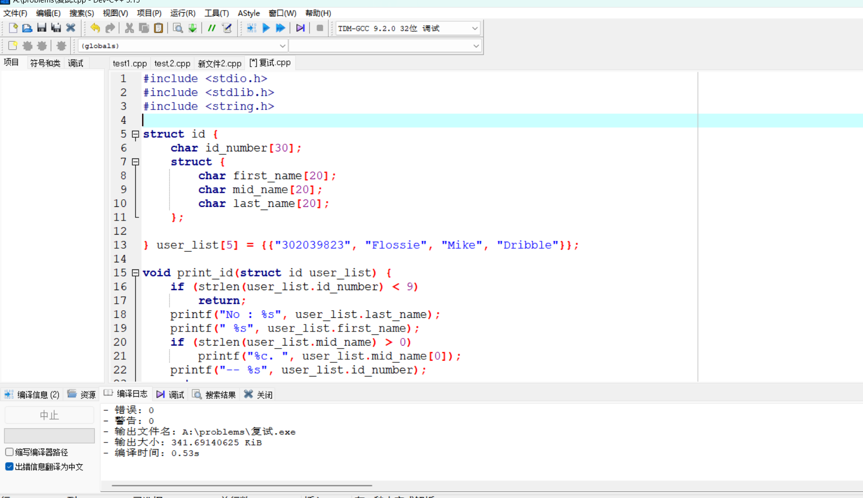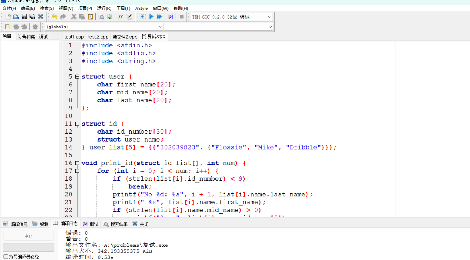 问题:第二题在首次编写过程中的第一个strcut结构体在第二个struct结构体的外面,导致后续函数的引用时出现问