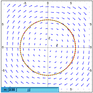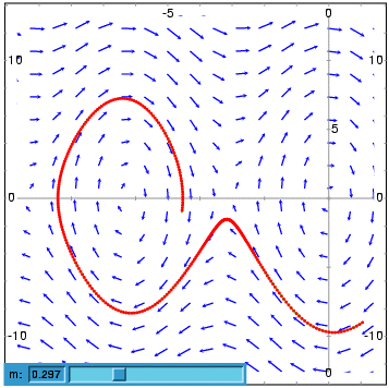 - The following example shows the direction field of a harmonic oscillator, defined by the two equations dz/dt = v and dv/dt = -k*z/m, and the integral curve through (z,v) = (6,0), with a slider that will allow you to change the value of m interactively (k is fixed at 2):
