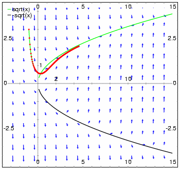 - (%i1) plotdf(x-y^2,[xfun,"sqrt(x);-sqrt(x)"],