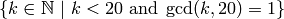 sage: [ k for k in [1..19] if gcd(k,20) ==