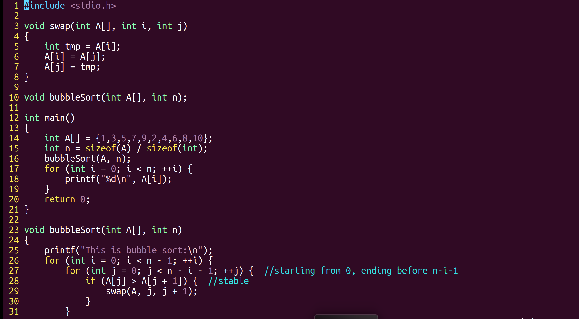 冒泡排序bubbleSort()直观上可以解释为小的元素像气泡一样浮到前面来,大的元素沉到后面去。算法设计思想是两层循环,外层循环每一次操作将最大元素沉底,内层循环每次处理的数据数量减一,沉底的元素就不考虑了。