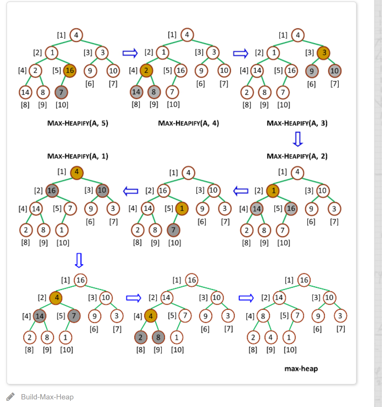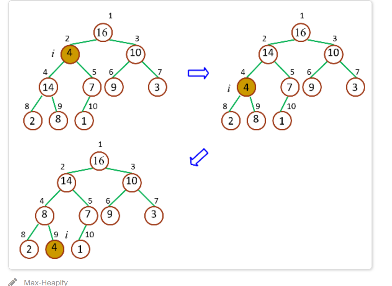heapify():最大堆调整,维持堆的性质。时间复杂度O(logn)