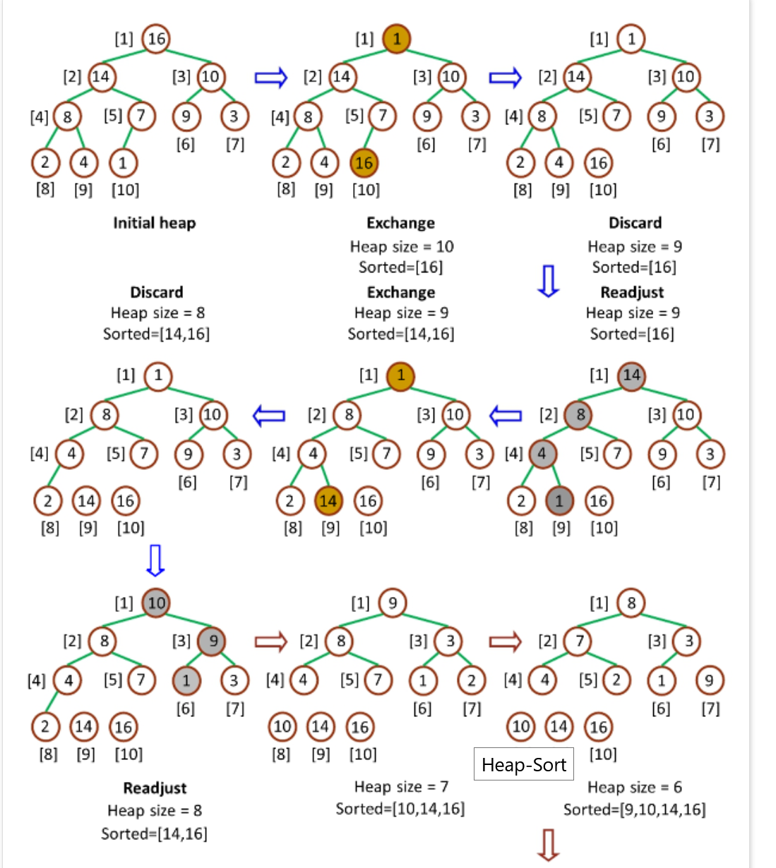 heapSort():from n to 2执行exchange A[1] with A[i] and heapify()。时间复杂度O(nlogn)
